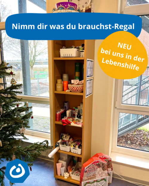 Ein „Nimm dir, was du brauchst“-Regal ist ein frei zugängliches Regal, in dem gespendete Lebensmittel und Dinge des täglichen Bedarfs liegen. Kundinnen und Kunden der Lebenshilfe können sich dort kostenlos das nehmen, was sie gerade brauchen – ganz unkompliziert und ohne Voraussetzungen.